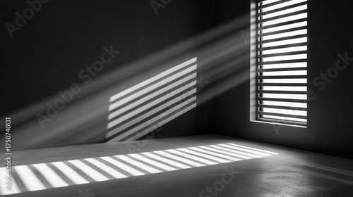 Fototapeta premium Interior of empty room with window shadows creating striking patterns on the floor and walls in black and white aesthetic