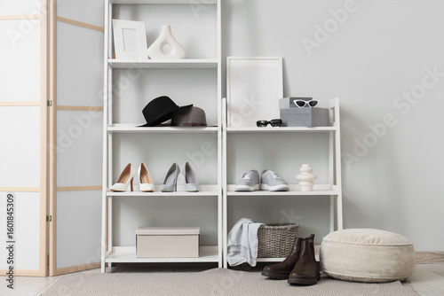 Fototapeta premium Interior of light hallway with shelf units, women's shoes and folding screen
