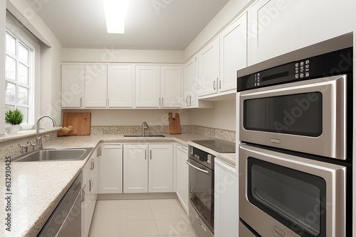 Fototapeta premium Interior of light kitchen with washing machine, oven and white counters