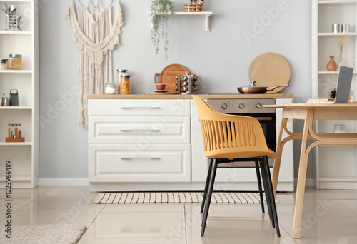 Fototapeta premium Interior of light kitchen with white counters and dining table