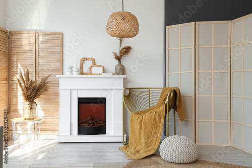 Fototapeta premium Interior of light living room with armchair, fireplace and folding screen