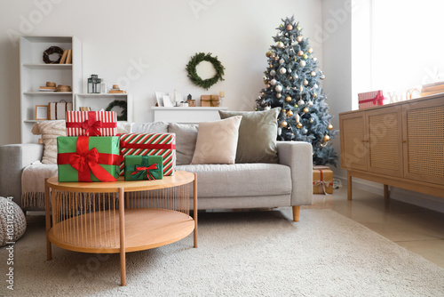 Obraz premium Interior of light living room with sofa, Christmas tree and presents on table