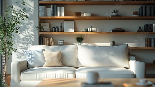 Fototapeta premium Interior of light living room with sofa shelving units and coffee table : Generative AI