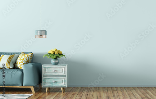 Obraz premium Interior of living room with blue sofa and chest 3d rendering