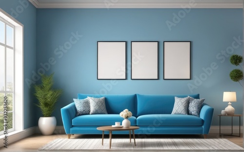 © Hendry, Fototapeta premium Interior of living room with blue sofa 3d rendering
