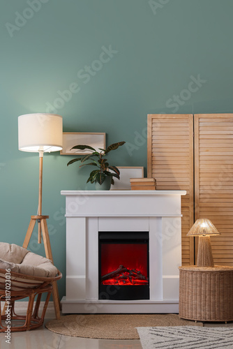 Fototapeta premium Interior of living room with folding screen, glowing lamps, armchair, wicker table and home decor on fireplace near blue wall