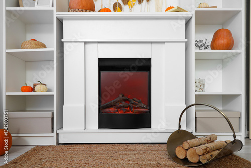 © Pixel-Shot, Naklejka premium Interior of living room with pumpkins, fireplace and shelf units