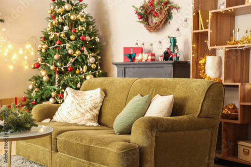 Obraz premium Interior of living room with sofa and glowing Christmas tree