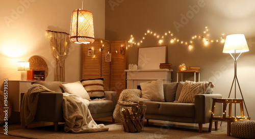 Obraz premium Interior of living room with sofas and glowing lights at night