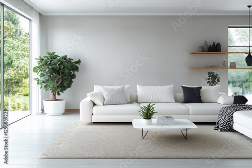 © aekkorn, Fototapeta premium Interior of living room with white sofaand coffee table panorama .