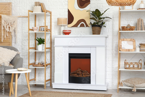 Naklejka premium Interior of modern living room with fireplace, shelving units and armchair