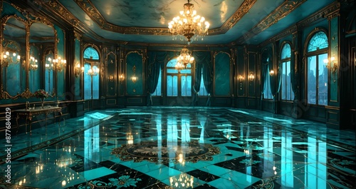 Obraz premium interior of palace room hall mansion mosque museum castle. turquoise blue green and gold gothic baroque design and decor with floral embellishments and ornaments. luxury house.