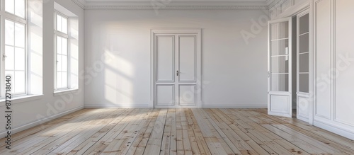 Obraz premium Interior of spacious empty living room with whitewash walls laminated floor with white doors and wooden wardrobe. with copy space image. Place for adding text or design