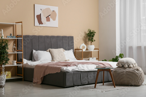 Obraz premium Interior of stylish bedroom with shelf units, pouf and table