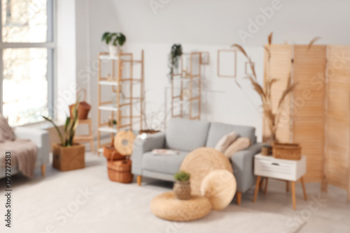 © Pixel-Shot, Obraz premium Interior of stylish light living room with grey sofa, braided baskets, coffee table and pampas grass, blurred view