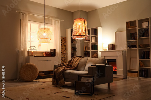 Fototapeta premium Interior of stylish living room with grey sofa, fireplace and bookshelves at evening
