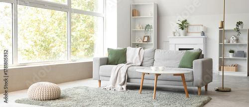 © Pixel-Shot, Fototapeta premium Interior of stylish living room with grey sofa, shelf units and plants
