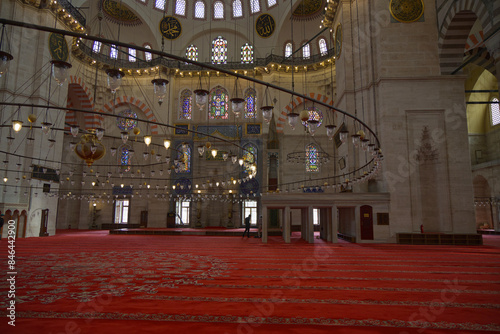 Obraz premium Interior of Suleymaniye Mosque with ornate arches and hanging lanterns....