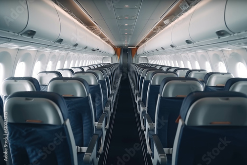 Fototapeta premium Interior of the aircraft, a row of seats in the flight of the aeroplane. AI