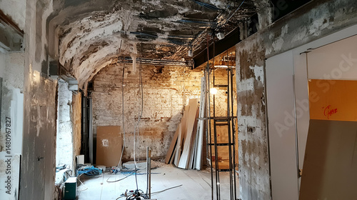 Obraz premium Interior Renovation of an Old Building with Exposed Stone Walls