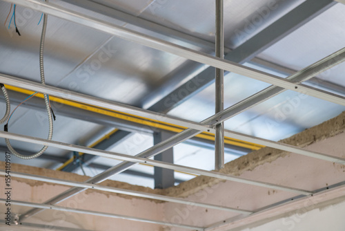 © Jirawatfoto, Obraz premium Interior renovation project focuses on ceiling framework installation. Exposed electrical wiring runs along new aluminium grid system before final finishing