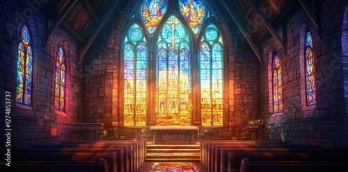 © RizArt, Obraz premium Interior view of a church with stained glass windows