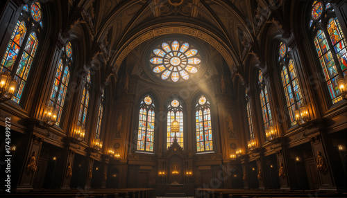 © Nata, Fototapeta premium Interior view of a stunning synagogue with beautiful stained glass windows and serene lighting