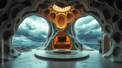© Father Studio, Obraz premium Interior view of a unique architectural structure with cloudscape backdrop