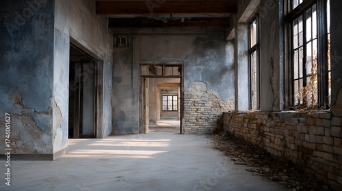 Obraz premium Interior View of an Abandoned Building with Light Filtering Through Broken...
