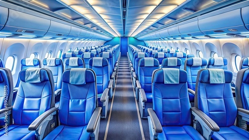 © Musarrof, Fototapeta premium Interior view of an empty airplane cabin featuring rows of blue seats, ready for passengers.