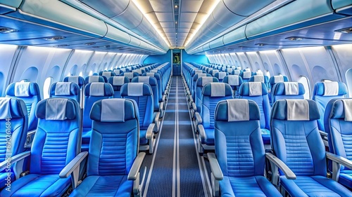 © Musarrof, Obraz premium Interior view of an empty airplane cabin featuring rows of blue seats, ready for passengers.