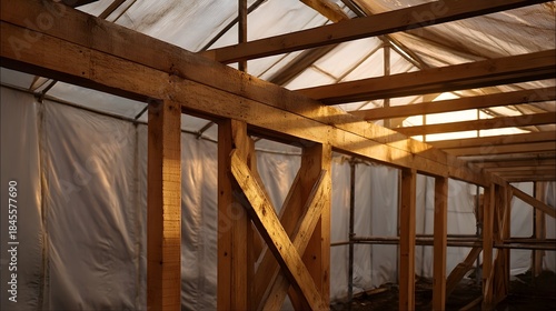 © Thares2020, Fototapeta premium Interior view of an unfinished wooden frame structure covered in translucent sheeting bathed in warm dramatic golden hour sunlight