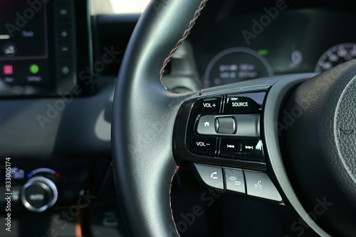 © sutichak, Naklejka premium interior view of car with black leather, steering wheel with button