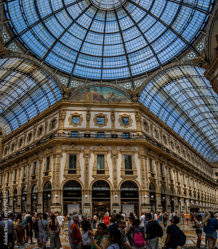 Naklejka premium Interior view of Galleria Vittorio Emanuele II in Milan with glass dome, ornate facades, and decorative fresco under bright daylight