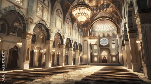 © Palugada, Fototapeta premium Interior View of Mosque with Geometric Patterns, Chandeliers, and Prayer Mats