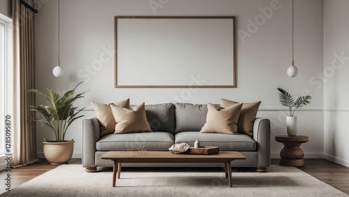 Fototapeta premium Interior wall mockup showcasing a sofa with beige cushions set against a...