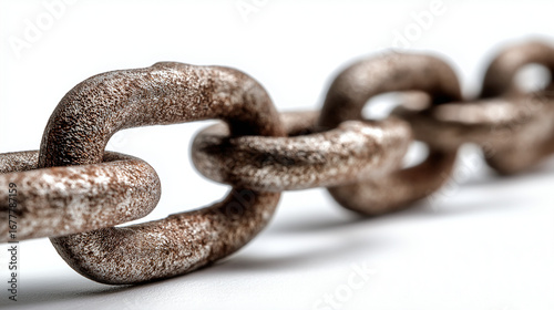 © Ramses, Obraz premium Interlocked rusted metal chain links forming a strong, continuous connection, shown isolated on a clean white background with sharp detail and reflective texture.