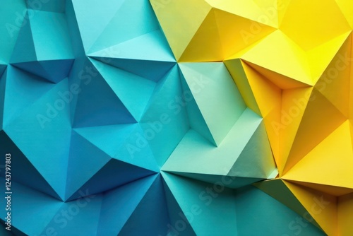 Obraz premium Interlocking blue and yellow paper triangles form complex geometric pattern background , angular, surface