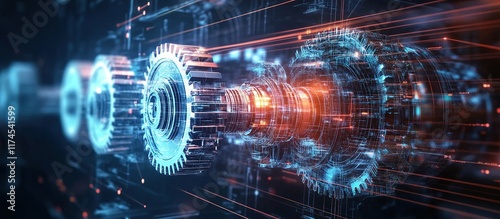 Obraz premium Interlocking gears in motion, digital technology concept.