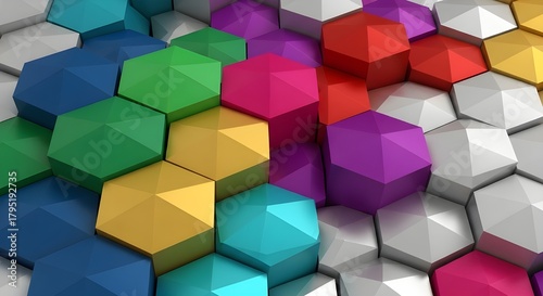 © S. I. PERERA, Obraz premium Interlocking hexagons filled with 10 colours, creating a crystal–like 3D effect