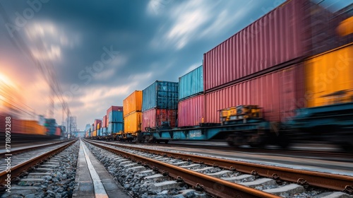 © Maryna, Obraz premium Intermodal Train. Freight Transportation of Cargo Containers on Railroad for Import and Export Logistics