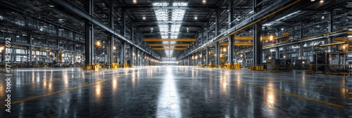 © Michael, Obraz premium Internal view of large empty factory or warehouse with many overhead cranes and support beams in the daylight