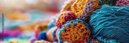 © GoshaMovies, Naklejka premium International Crochet Day. balls of knitting thread. knitted products