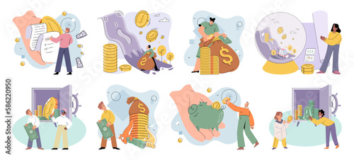 © Dmytro, Naklejka premium International investment company, money bills and coins fly around world. Global economy financial system vector set. Loan of money made by investor for purpose of earning interest. World cash flows