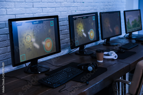Naklejka premium Internet cafe with modern computers for playing video games