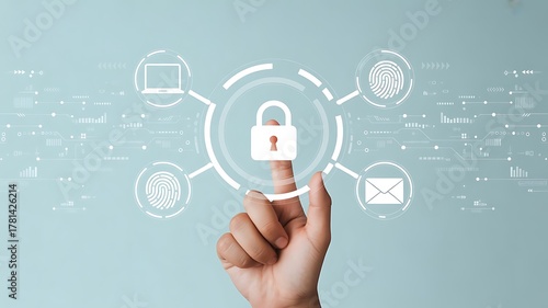 © Jubayer, Fototapeta premium Internet network security concept with hand pressing a button on a technology screen, lock icon on virtual screen, representing security, data protection