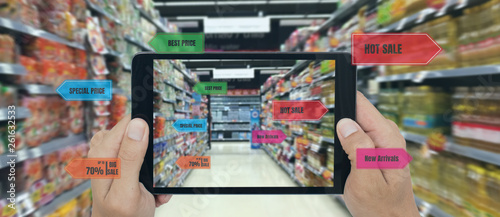 Naklejka premium internet of things marketing concepts,smart augmented reality,customer hold the mobile phone to see the product that search by ai application with hot deal,promotion code, in retail, store, market