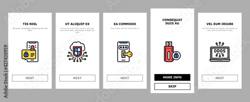© vectorwin, Fototapeta premium Internet Security Onboarding Mobile App Page Screen Vector. Internet Ddos Computer Attack And Flash Drive With Virus, Binary Code In E-mail Message And Hacker Illustrations