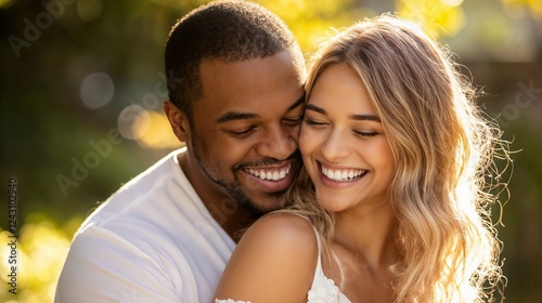 © InspirationDesign, Fototapeta premium Interracial couple embracing in evening light. Perfect for relationship content, modern love stories, and authentic connection themes.