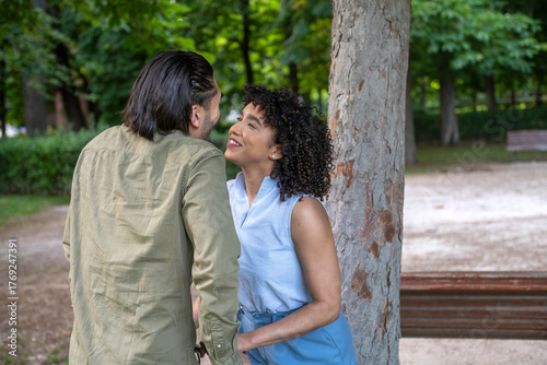© GREGORIO, Fototapeta premium Interracial couple smiling, gazing lovingly in park
